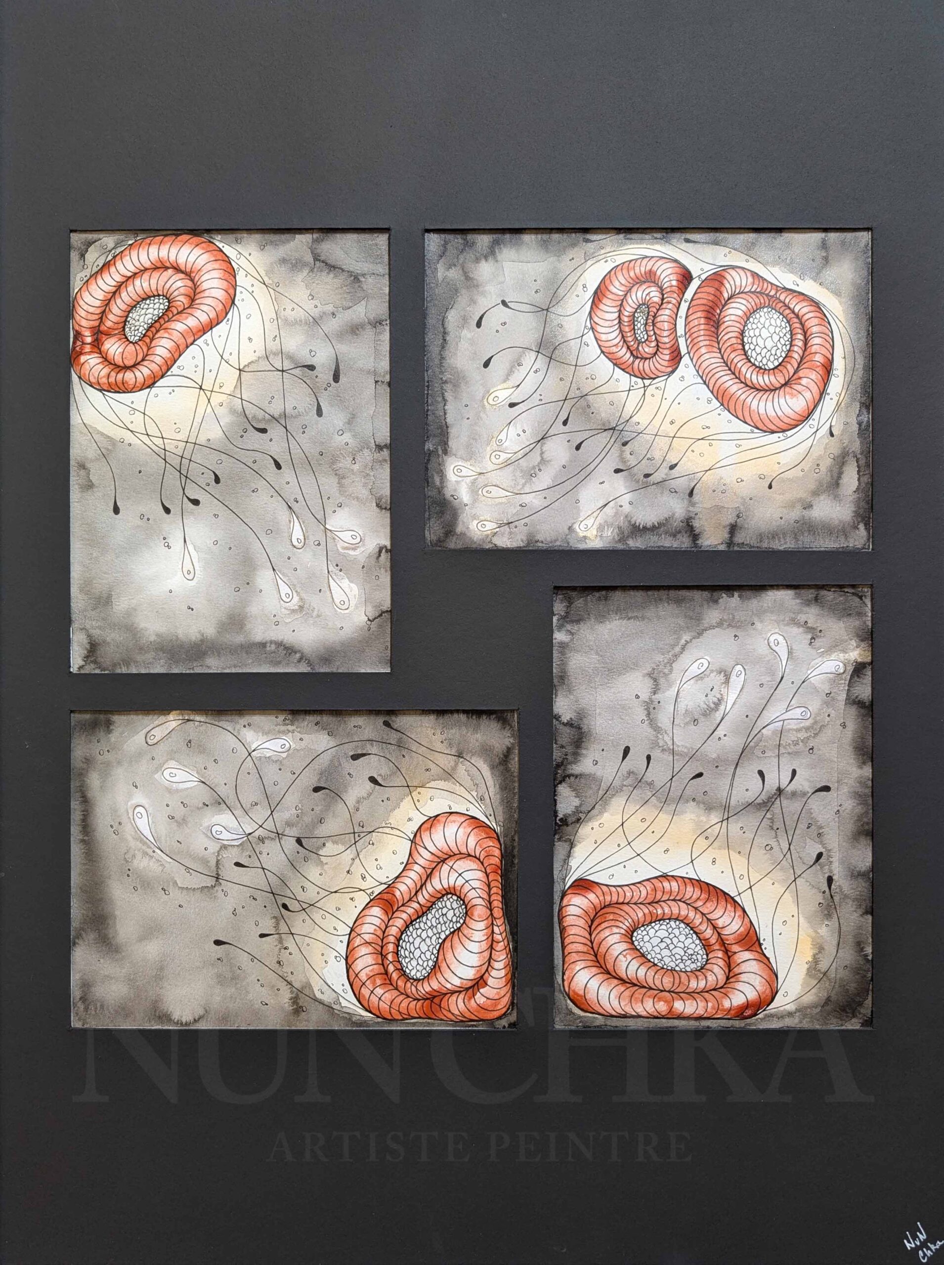 Virement ou espècesAssemblage sur passe-partout de 4 dessins de Format 21 x 29,7 cm